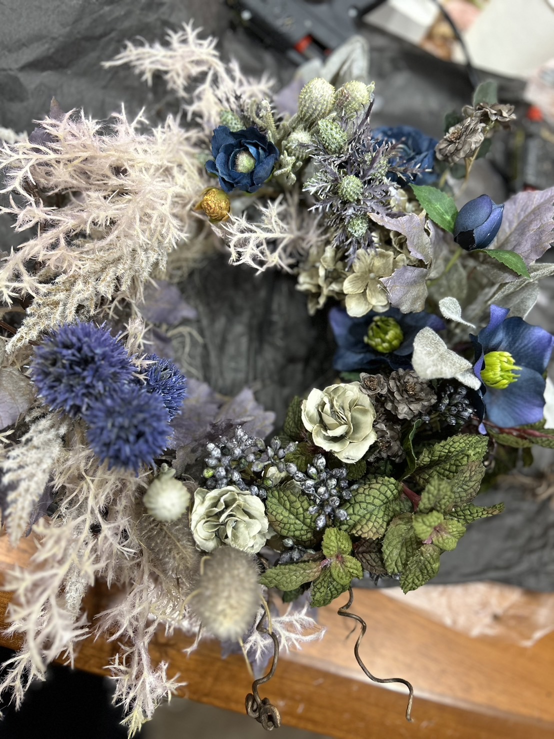 最初はちゃんとカタチになるか、途中上手くできず焦ったり、黙々と進めてましたが、牧島先生のアドバイスのおかげでイメージしていた以上に大満足のリースができ嬉しいです✨🧚♀️